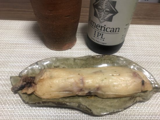 先日買った伊勢角屋麦酒&若松屋のさつま揚げセットを昨日、自作の器でいただきました。