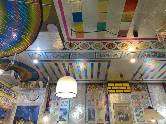 お店の方はアートの専門家ではなく、もともとは壁や天井の汚れの補修や防寒対策からはじまって、このようにアルミをはったりして作り上げていかれたとのことです。専門家ではないとのことですが細部まで仕上げがとてもきれいで、彩りも美しくて見とれました。“丘”のシールもお客様が貼られたりして、アートは日々進化しているとのことです。