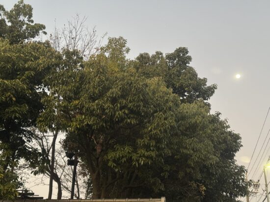 満月の数日後でお月様もきれいでした。6時半ごろで、公園でちょうどラジオ体操が始まっていました。