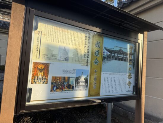 ウォーキングの翌日が成道会(お釈迦さまが悟りを開いた日12/8の法要)で、ポスターが掲示してありました。日泰寺には仏舎利(お釈迦さまのご遺骨)もご安置されています。