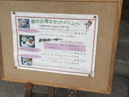 店頭の看板より 朝のお得なセットは8時から10時半までです。
