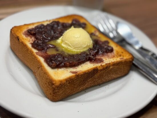 全国チェーンのお店ですが、ご当地メニューであんバターのモーニングがありました。焼きあんバターと焼きあんホイップバター、どちらも迫力があっておいしそうです。ほかのモーニングも野菜たっぷりでおいしそうです。