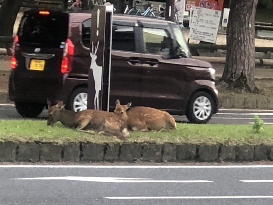 般若寺を4時ごろ出て10分も経たないうちに奈良公園の駐車場が見えてきました。20分以内無料とかかな?と思ってろくに確認せず入ると、1日1000円…。4時から千円なんてぜったい元取れないわ…とせこいことを思ってしまいましたが、せっかくなのでゆっくり鹿とたわむれようと腹をくくりました。中央分離帯に鹿がいてびっくり。
