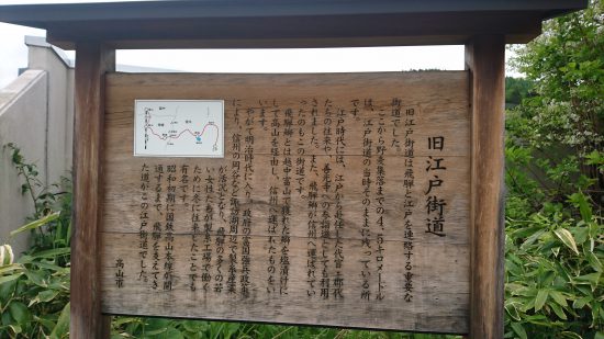 施設の入り口側の道路に立って、左が高山市、右が松本市です。