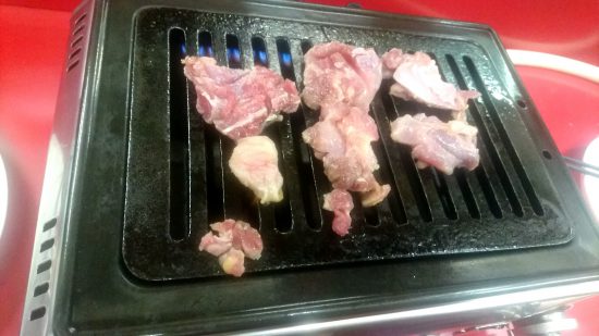 各テーブルにはガスコンロが備え付けられています。ここで各自でとりを焼きます。