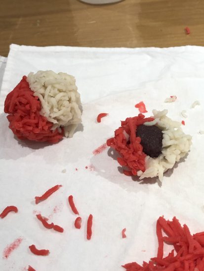 気を取り直して、きんとんに進みます。先に一部の生地を色付けし、寒牡丹を作っている間になじませておきます。