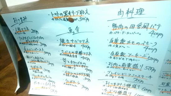 グラスワインをいろいろいただきました。土曜は15時から営業されているので、夜だとなくなり次第ワインの種類も入れ替わります。が、それもまた楽しみです。
